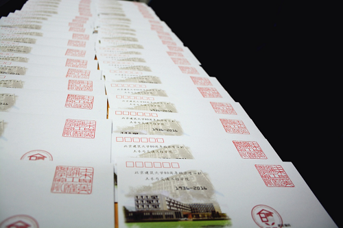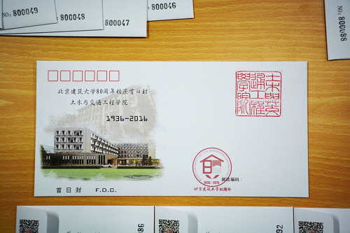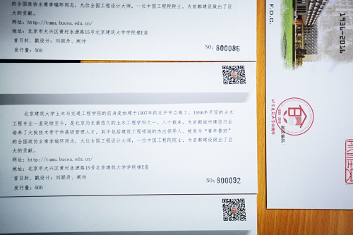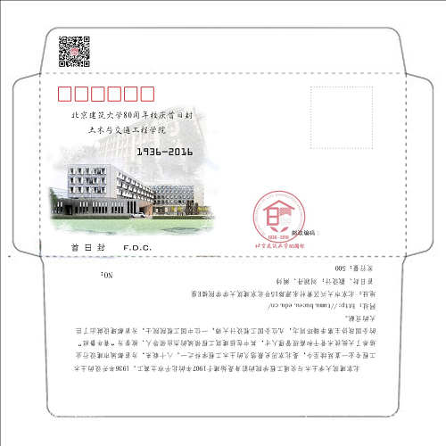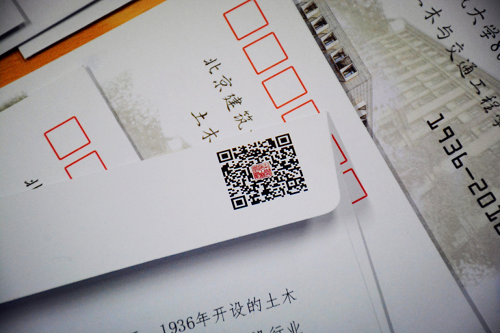 首日封的封口处,为低端影视 公众号“北建土木”的二维码,校友可以通过扫描二维码关注学校、学院的相关信息。