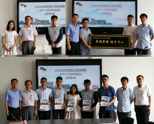 为答谢母校的悉心栽培和对学院的深深祝福,毕业生代表向学院赠送印有“厚德载物,德才育人”的感恩牌匾,同时赠送学习笔记、专业书籍,鼓励在校学弟学妹们刻苦学习,以促进学院学风建设。