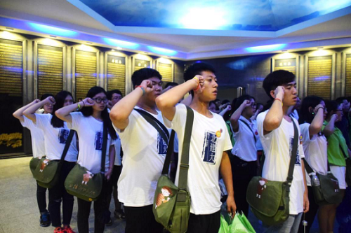 吊唁大厅中,基地老师为实践团员们讲解了井冈山烈士的英勇事迹,面对着四周墙面嵌刻的在井冈山革命斗争时期壮烈牺牲的15744位烈士英名录,实践团员们不禁动容。吊唁结束,所有实践团员举起右拳,重温入党誓词,铿锵有力,字字入心。