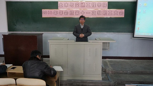 随后,学院党委书记何立新对2016年学院工作提出了具体要求,并通报了重点事项。他指出2016年是极为关键的一年,学院面临合理布局两校区办学、迎接土木工程专业复评、承办国家级和市级学科竞赛等一系列重大挑战,希望各位老师能够合理安排工作计划、严格保证工作进度、全面提升工作效率、总结凝练工作成果,为学院建设贡献出自己的一份力量。