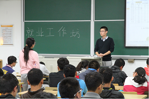 的近三年考研数据来直观的告诉大家考研和就业的差别以及考研的难度和要求,他希望大家“根据自身情况的考量和听取老师的意见来选择自己是否真的合适考研”,学长的理性而又客观的一番话让到场的同学们觉得应该重新审视自己设定的毕业目标。随后张佳滨校友给大家就11级同学们的就业情况为例做了非常详细的就业情况分析。学长不仅分析了就业的单位情况,还详细的剖析了签约单位的优势和劣势。接着学长讲了就业的时间轴,随着PPT上时间轴的起落也使大家心里也倍感压力。最后,学长就选择就业方向、选择就业单位、面试注意事项等跟大家做了分享,把自己就业选择的体会和面试的宝贵经验毫不保留的分享给大家。工作坊途中同学们多次自发的响起了阵阵掌声。