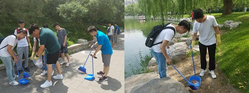 为了贯彻“爱国、进步、民主、科学”的五四精神,六个小组分别在陶然亭公园内进行打扫公园卫生的活动。党员们拿着清洁工具,不怕脏不怕累,不放过公园内任何一个有垃圾的角落。尽管室外温度达到了38℃,尽管每一个人的后背都已被汗水湿透,可大家的热情似乎盖住了38℃的高温。随着一路走来,看着美丽的陶然亭公园,园内林木葱茏,花草繁茂,楼阁参差,亭台掩映,景色非常宜人。男女老少,唱歌跳舞,一派歌舞升平。顿时感觉前辈们的奉献以及吾辈的一切都是有意义的。这才是一名中国共产党员毕生奉献的最美成果。