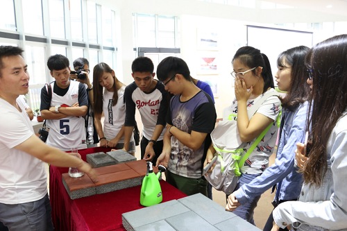 首先大家来到贵州贵仁生态砂科技有限公司进行参观,该公司研发了高科技砂基透水砖、透水混凝土等路面材料,构建一套生态砂基透水系统和雨水渗透过滤收集系统。遇到雨天,雨水将被立即吸收并渗透进土壤,补充地下水源。之后师生们又参观了贵安海绵城市的室外展区,行走在展区中,师生们共同探讨了关于海绵城市的一些想法。