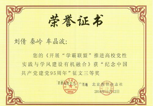 11月12日上午,由首都高校党建研究基地和北京教育杂志社主办的高校党建理论与实践工作创新论坛暨建党95周年征文表彰会在北京航空航天大学隆重召开。北京市委教育工委组织处处长李丽辉、首都高校党建研究基地、北京教育音像报刊总社、北京教育杂志社有关领导及来自全国高校等近40家单位的领导和代表参加论坛。我校组织部副部长李云山以及组织部、低端影视 相关人员参加了论坛。低端影视 党委副书记车晶波在论坛上作专题报告,介绍低端影视 基层学生党组织建设的工作创新。我校《开展“学霸联盟” 推进高校党性实践与学风建设的有机融合》荣获征文比赛三等奖。
