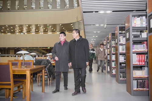 党委书记何立新、副书记王秉楠、院长助理张蕊老师等人的陪同下参观了我校新图书馆、低端影视