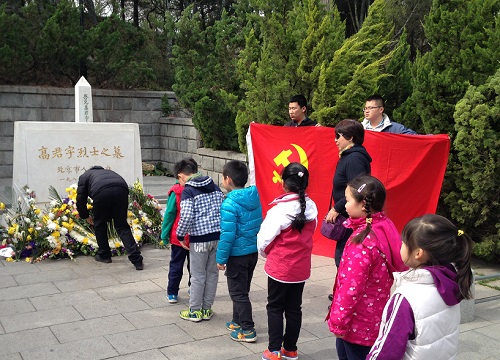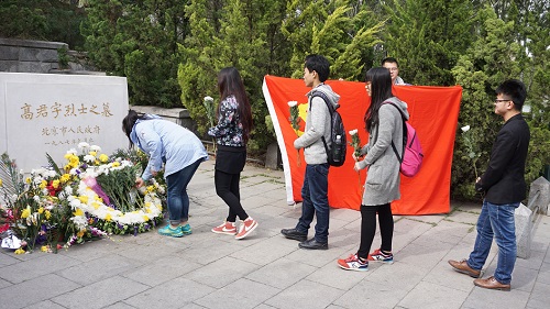 学生们排着整齐的队伍,手捧菊花,怀着对烈士无限崇敬的心情来到高君宇烈士墓前进行祭扫活动。高君宇烈士是五四运动时为北京大学学生会负责人,与李大钊同志一起进行党的统一战线工作,帮助孙中山改组国民党。但是由于过度操劳,严重摧残了他的身体,又因急性阑尾炎病逝。