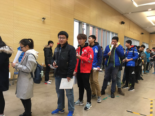 学生活动中心集合,布置会场并分配活动工作。随着约定时间的临近,17名研究生和52名本科献血志愿者陆续来到了现场,大家怀揣着忐忑与激动,井然有序地排着队、安静的等待着。