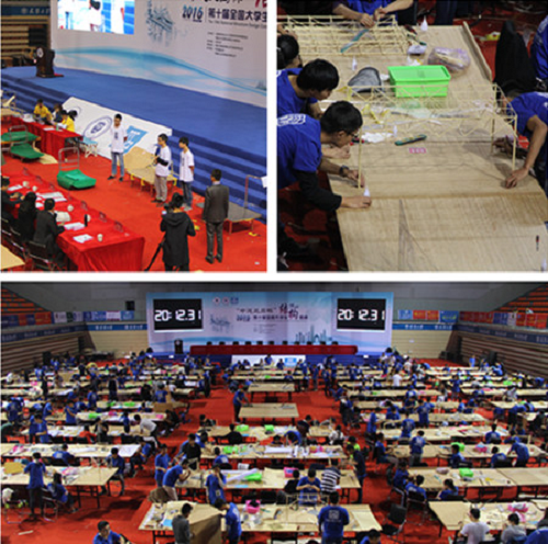 全国大学生结构设计竞赛是土木工程学科参赛高校最多,影响力最大的最高水平学科竞赛。大赛宗旨在于培养大学生的创新意识、合作精神,提高大学生的创新设计能力、动手实践能力和综合素质。本届大赛由天津大学承办,来自清华大学、哈尔滨工业大学、同济大学在内的124所高校、125支竞赛队伍参赛。本届大赛赛题为“大跨度屋盖结构”,立足于结构设计极限状态的基本概念,融入刚柔并济的结构设计理念,激发大学生的创新能力,同时也使比赛富于竞争性、不定性,增加比赛的观赏性。在模型制作期间,学生以自己的专业知识为基础,充分发挥其创新能力,他们争取抓住每一个细节,做好精确的受力分析,努力使模型达到最佳状态。模型加载环节更是比赛的精彩环节,紧张的氛围几乎可以让人窒息,在这最后关头,各个参赛队伍更加团结,齐心协力共同完成每一个步骤。同学们努力拼搏,严格遵守竞赛规则和评委纪律,公平竞争。