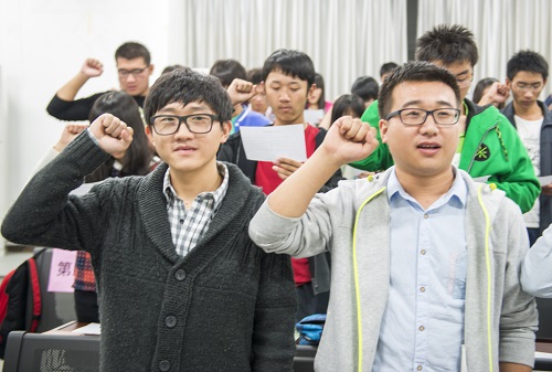 紧接着,在主持人的带领下,我们进行了隆重的宣誓仪式。宣誓内容涵盖学习、生活、学生工作三大方面,要求学生骨干在学习上做“领头羊”,在生活上做到和谐、融洽,在学生工作上服务同学。