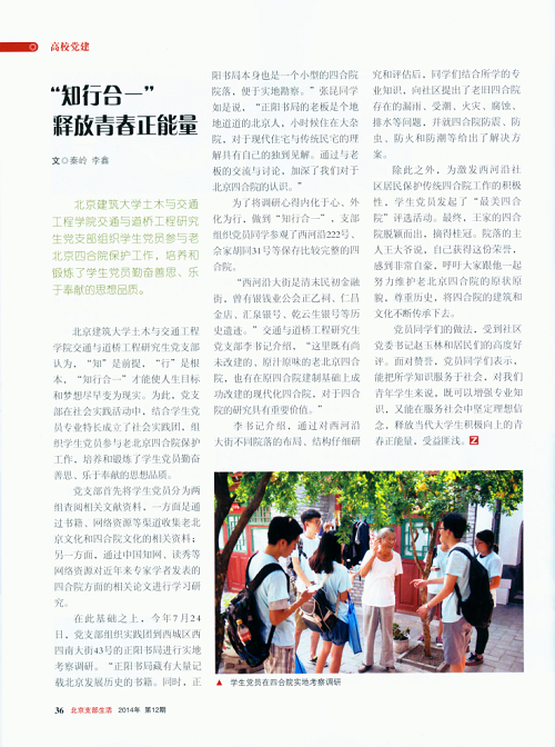 交通与道桥工程研究生党支部认为,“知”是前提,“行”是根本,“知行合一”才能使人生目标和梦想尽早变为现实。为此,党支部在社会实践活动中,结合专业特长成立了社会实践团,组织学生党员参与老北京四合院保护工作,培养和锻炼了学生党员勤奋善思、乐于奉献的思想品质。