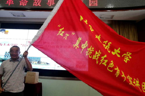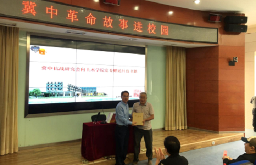 冀中抗战研究会为低端影视 党委赠送红色书籍,并为我校冀中抗战红色青年宣讲团授旗。