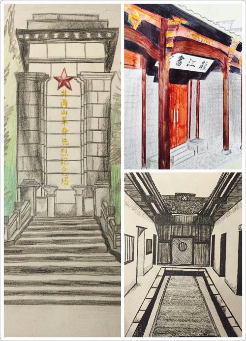井冈山的山水迤逦秀丽,井冈山的革命精神生生不息。看着历史遗迹,纪念建筑,风土人情,同学们不禁执起手中画笔描绘了一张张美丽的画卷。其中,土145班张雪媛同学所描绘的井冈山革命先烈纪念塔,凝聚了民族之魂。它记载着民族成长的沧桑岁月,见证着革命先烈的赤胆忠魂。如今站在这片神圣的土地之上,仰望着屹立在苍劲青松之中的这座丰碑,她如同茫茫海面上的一座灯塔,指引着华夏儿女在历史长河中勇敢前行。纵使历经时间年轮的无情碾压,她却在历史长河的洗礼中愈发闪耀。革命先烈视死如归,埋骨他乡,他们的事迹有关国家,有关民族,唯独无关自己!他们始终与身后的青松一起,向后人传承着不朽的英魂!伟哉,壮哉!