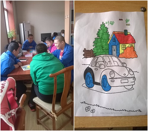 青协一行13人被分配到各个班。孩子们都很天真可爱,非常欢迎志愿者的到来,有的孩子还演唱了歌曲给志愿者们。这里的各种设备都很齐全,尤其是图书,语文、数学、音乐、美工、常识…等等,每位志愿者都找到了自己擅长的部分手把手地教这些孩子们。有的孩子比较内向,志愿者们尝试各种方法调动他们的积极性,尽自己最大的努力去让孩子们高兴,用最简单、最质朴的方式让这些残障儿童感受到世界的美妙神奇。