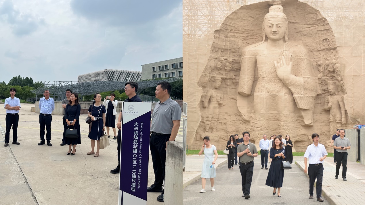 调研团一行先后参观了学院标志性成果与平台。科研创新平台:大型多功能振动台阵实验室、住建部建筑垃圾资源化利用创新中心;科技文化景观:大兴机场航站楼大比例缩尺模型、生态自发光道路铺装技术;文化遗产保护成果:云冈石窟第十八窟等比例3D打印模型;育人特色阵地:学院党建文化墙、北斗领航育人长廊等。