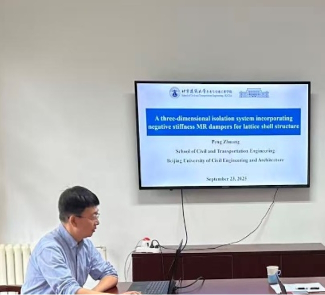 随后,“中巴研讨会:数据科学与机器学习在工程中的应用”在我校大兴校区对外交流合作处会议室正式举行。会议由低端影视 副院长李之红主持,菲利克斯副教授作首场专题报告,重点分享了他基于机器学习与数值模拟在结构分析与耐久性评估中的应用成果,引发在场师生的广泛关注与热烈讨论。我校张艳霞教授、祝磊教授、庄鹏副教授、尹飞副教授及博士生倪宇博分别结合自身研究方向,先后作学术汇报。张艳霞教授聚焦“北京大兴国际机场航站楼钢结构关键节点试验与性能研究”主题,分享了团队及我校在该领域的理论研究与应用案例;祝磊教授围绕自己的研究兴趣“文物遗产保护—兵马俑的保存方法”展开讲解;庄鹏副教授围绕“一种采用负刚度MR阻尼器的网壳结构三维隔震体系”展开讲解;尹飞副教授则对自己的研究方向进行了学术分享。最后,博士生代表倪宇博针对自己的研究课题“基于深度学习的索穹顶智能设计研究”进行汇报。双方就技术难点、合作切入点等展开细致交流,现场学术氛围浓厚。
