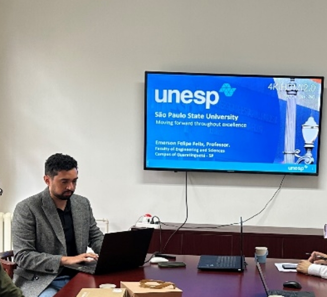 李之红副院长对菲利克斯副教授的到访表示热烈欢迎,并赠送具有低端影视 特色的纪念礼品。他介绍了我校的办学历史、学科特色以及在服务首都城乡建设方面的代表性成果。同时,他表示圣保罗州立大学土木工程专业作为巴西顶尖学科,在科研水平、教学严谨度和产学研结合方面优势突出,与我校学科规划和发展愿景高度契合,形成了战略上的同频共振。本次交流活动是既两校签署《校际合作协议》后,深入落实既有合作协议、推动共建共赢的重要举措,有效拓展了双方在师生互访、科研协作与学科共建等领域的合作空间。双方一致同意,将依托“一带一路”建筑类大学国际联盟,聚焦智能建造、智慧城市等前沿方向,加强学科协同与人才联合培养,共同为中巴两国建筑与土木工程领域输送高素质专业人才,推动行业技术创新与学科融合发展。菲利克斯副教授感谢我校的热情接待,并系统性的介绍了巴西圣保罗州立大学的独特魅力与雄厚实力。